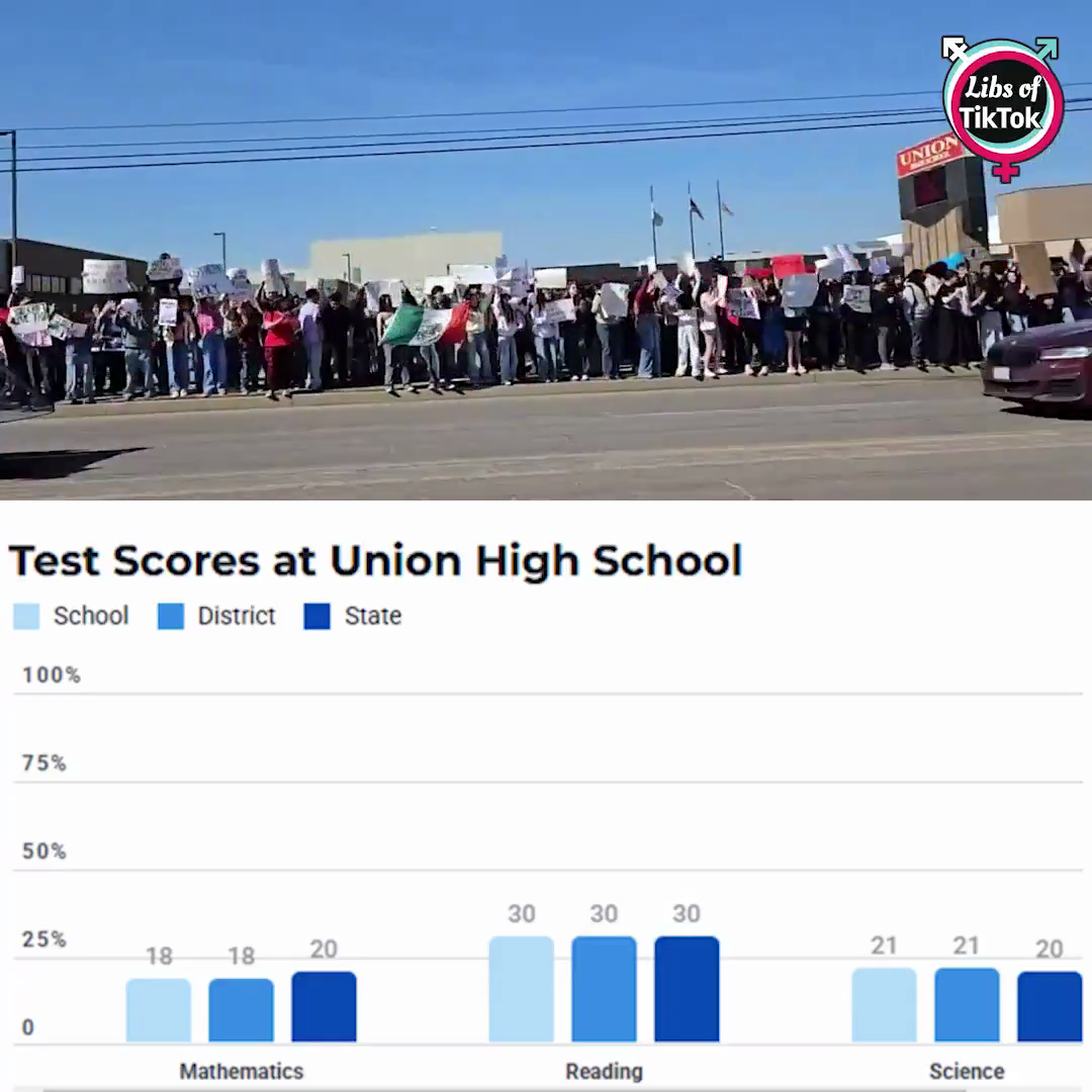 “INBOX: Students seen screaming and yelling at an anti-ICE protest held outside Union High School (@UnionSchools) in Tulsa, Oklahoma. Meanwhile, here are the scores for this school: -Only 18% of students are proficient at reading -Only 30% are proficient at math -Only 21% are proficient in science. This is what our public education system has become.” - @LibsofTikTok